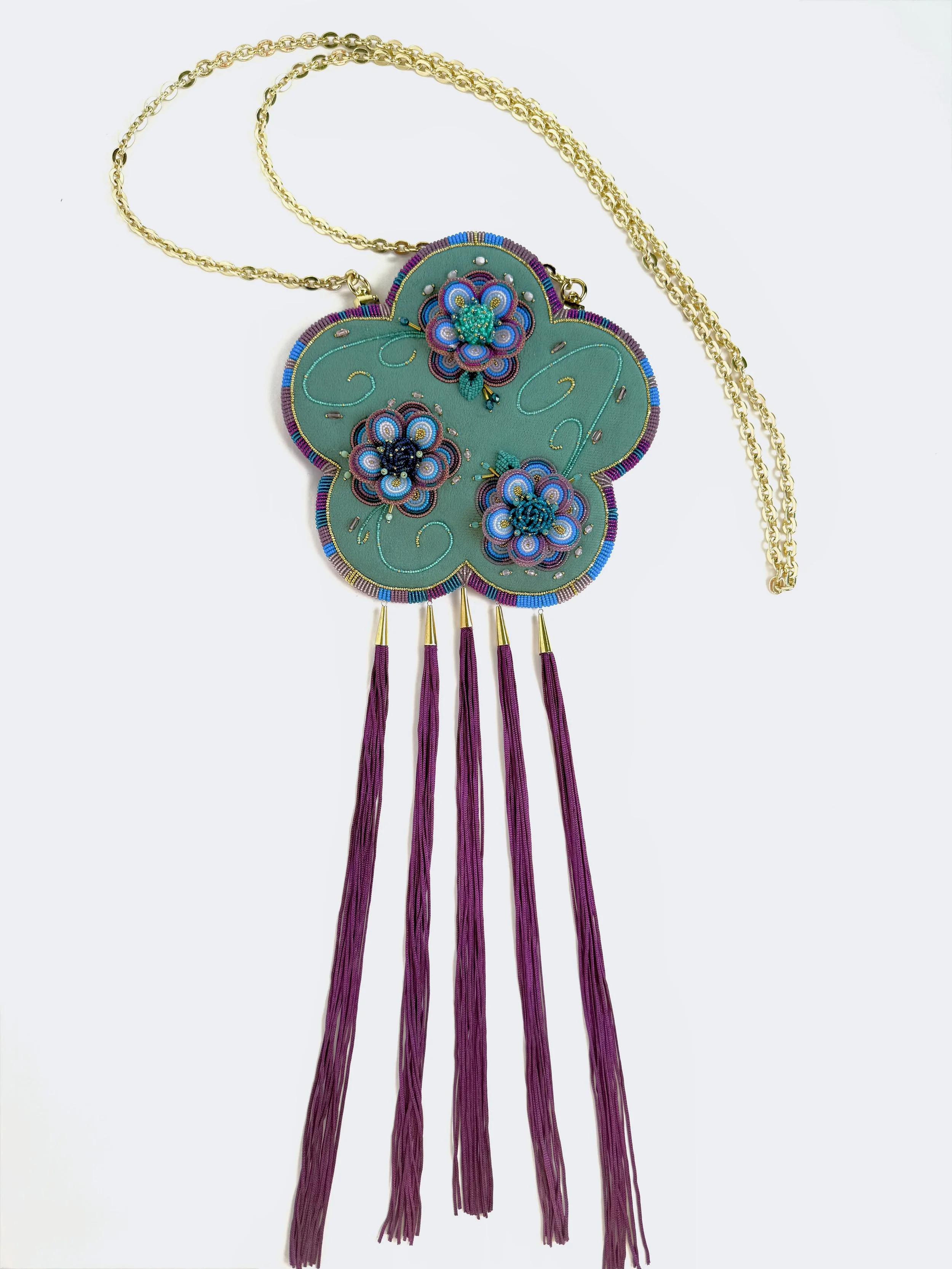 A floral shaped, crossbody, flat bag, coned fringe tassels, beaded with 3d florals, and a silk pocket lining. Each beaded flower is multi-level with a top of independently curved petals. 13* and 15* glass seed beads, commercial moose hide, velveteen.