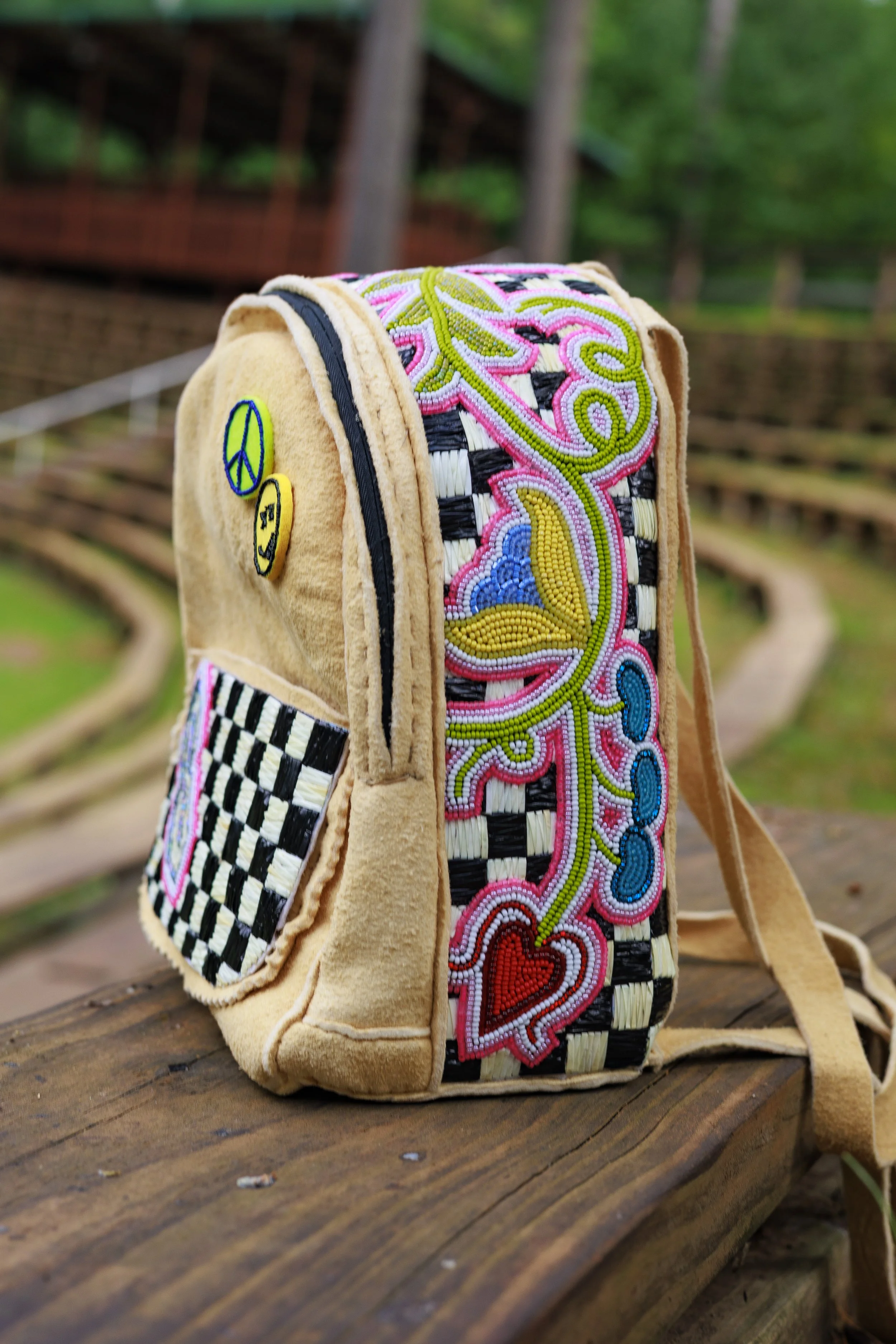 This hand constructed mini backpack represents the artist’s youth. Growing up in the 90s as an adolescent meant trying to find where or where not to ‘fit in.’ In retrospect, seeking a sense of belonging tends to gnaw at many youth and adults alike. This creation draws on some iconic imagery from the 90s while maintaining footing in contemporary and historical connections. The use of bead colors on traditional and non-traditional woodland florals shows a sense of today’s colorways while echoing works of the past. The black and white quill background done crosshatched in a checkered pattern represents not only a punk-rock sensibility but also the dichotomy of black and white, shadow and light. At the crossroads of our adolescence, we begin to decide what is right and wrong and test the limits of our possibilities. This piece is about a youth reimagined and woven with the strength of culture to gain nourishment and confidence.